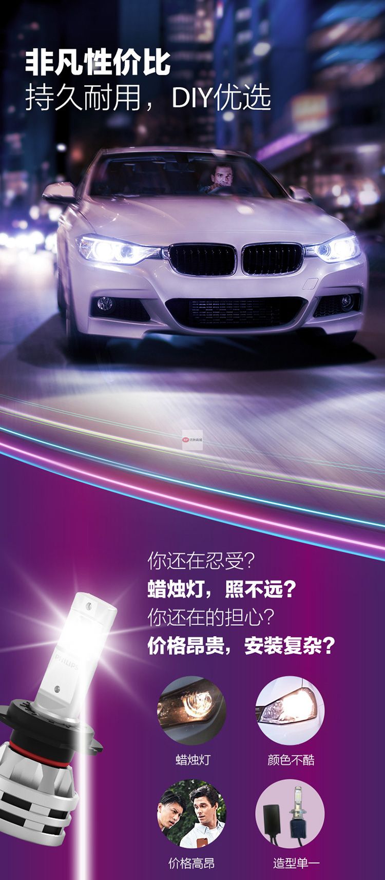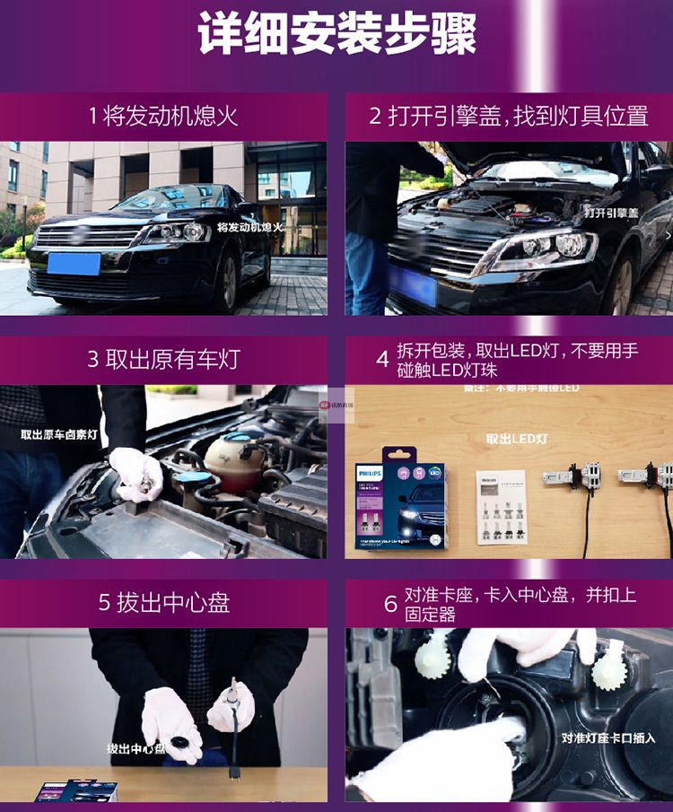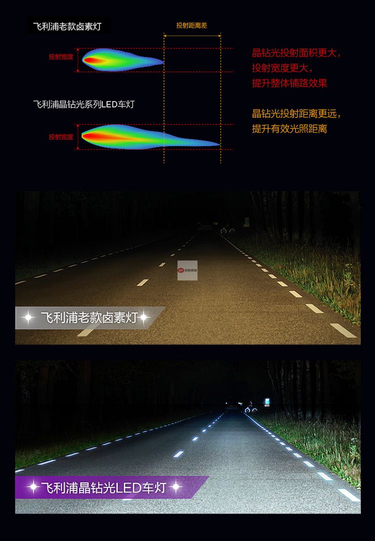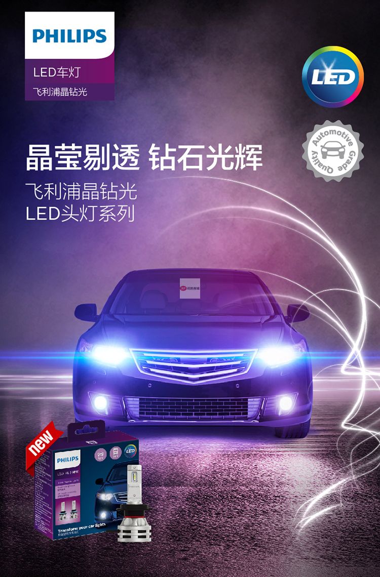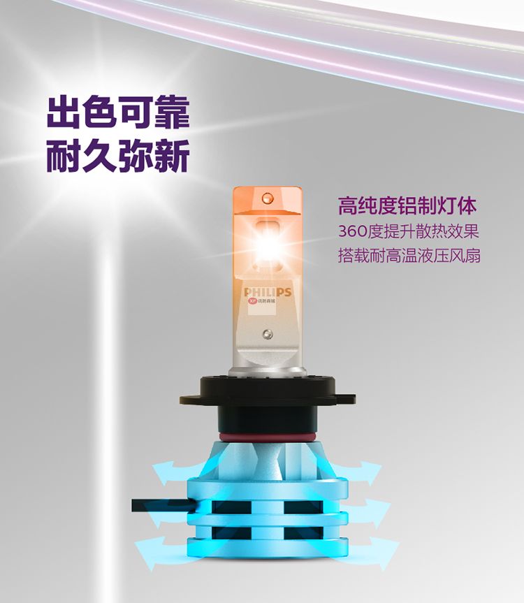 自營飛利浦(PHILIPS)晶鉆光 汽車LED大燈 H7 LED汽車車燈 無損安裝遠光燈近光燈 6500K時尚白光 雙支裝