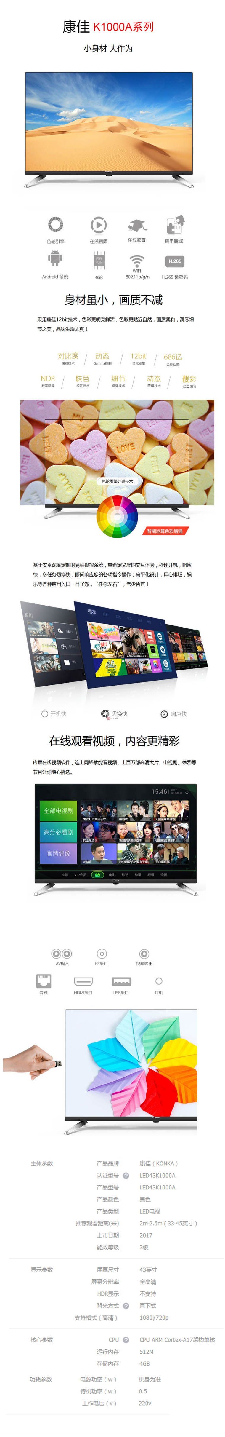 商品名稱:康佳(KONKA)43英寸 LED43K1000A 全高清智能電視 黑色