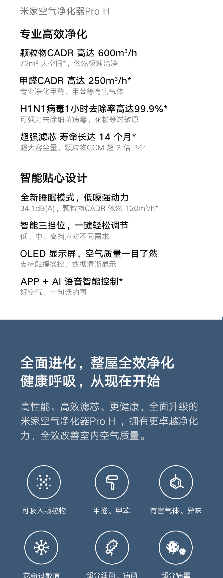 自營米家 小米空氣凈化器Pro H 家用除甲醛病毒異味二手煙 靜音設(shè)計 600m3/hAC-M7-SC