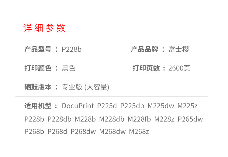 商品名稱:富士櫻 P228b墨粉盒 適用施樂P228b/db M228b/db/fb/z P225d/db M225dw/z P265dw P268b M268z打印機(jī)CT202332