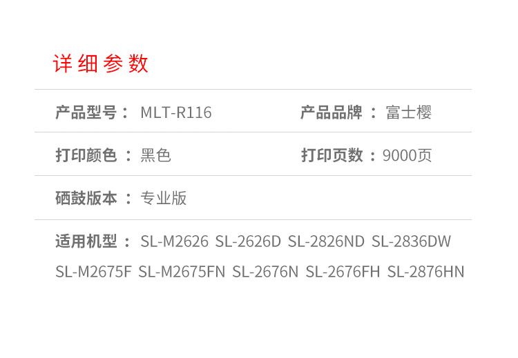 商品名稱:富士櫻(FUSICA)R116黑色硒鼓組件 適用三星SL-M2626 2626D 2826ND 2836DW 2675FN 2676N 2676FH 2876HN