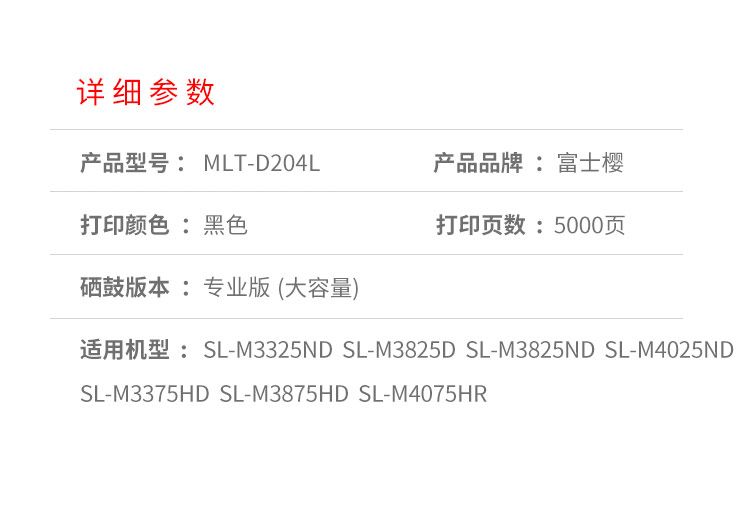 商品名稱:富士櫻(FUSICA)D204L黑色粉盒 適用三星SL-M3325ND M3825D M4025ND M3375HD M3875HD M4075HR