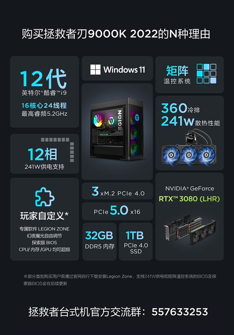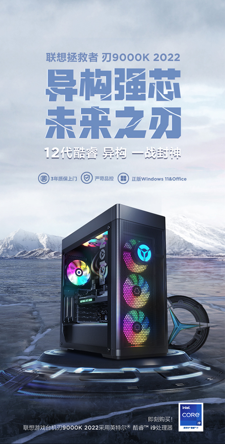 自營聯(lián)想(Lenovo)拯救者刃9000K 2022游戲電腦主機(12代酷睿i9-12900KF RTX3080 10G LHR顯卡32G DDR5 水冷側透 )