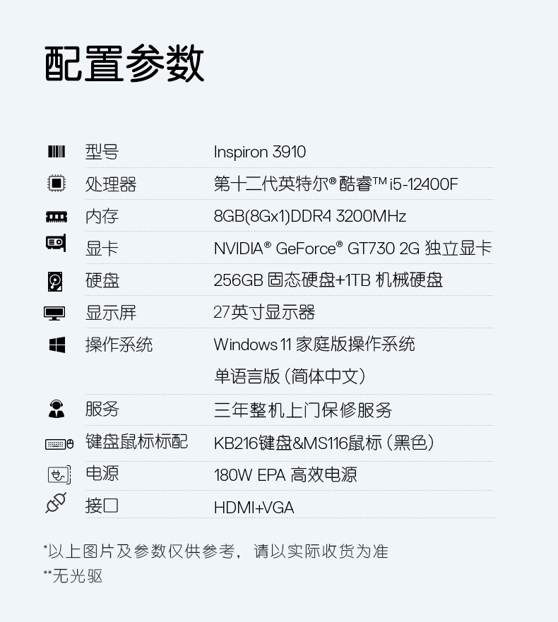 商品名稱:戴爾DELL靈越3910 家用辦公電腦 商務(wù)臺式機(jī)電腦主機(jī)(12代i5-12400F 8G 256G+1T 2G獨(dú)顯 )27英寸整機(jī)