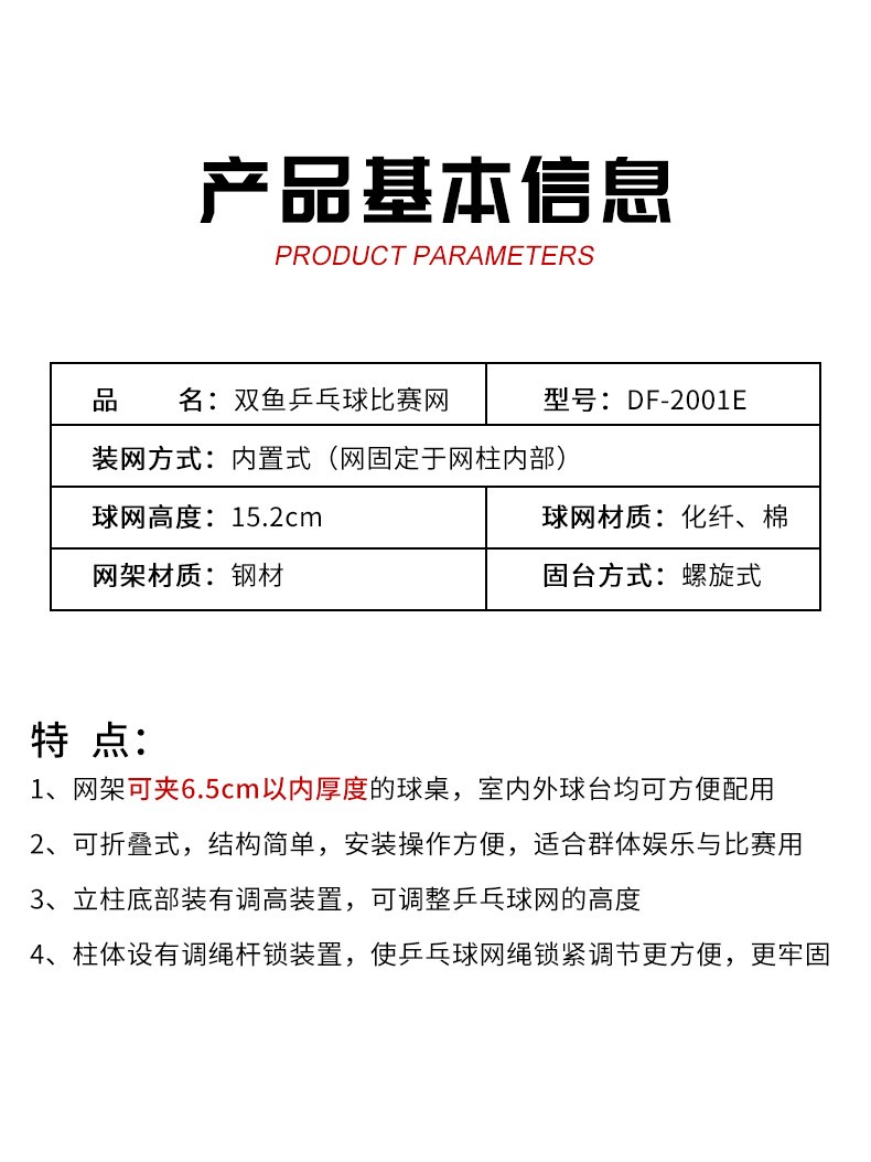商品名稱:雙魚乒乓球網(wǎng)架套裝2001E6.5cm加厚 深藍(lán)色