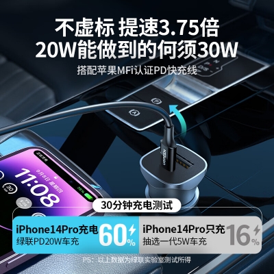 商品名稱:綠聯(lián)車載充電器PD20W超級(jí)快充汽車點(diǎn)煙器USB擴(kuò)展口車充轉(zhuǎn)換插頭蘋果14