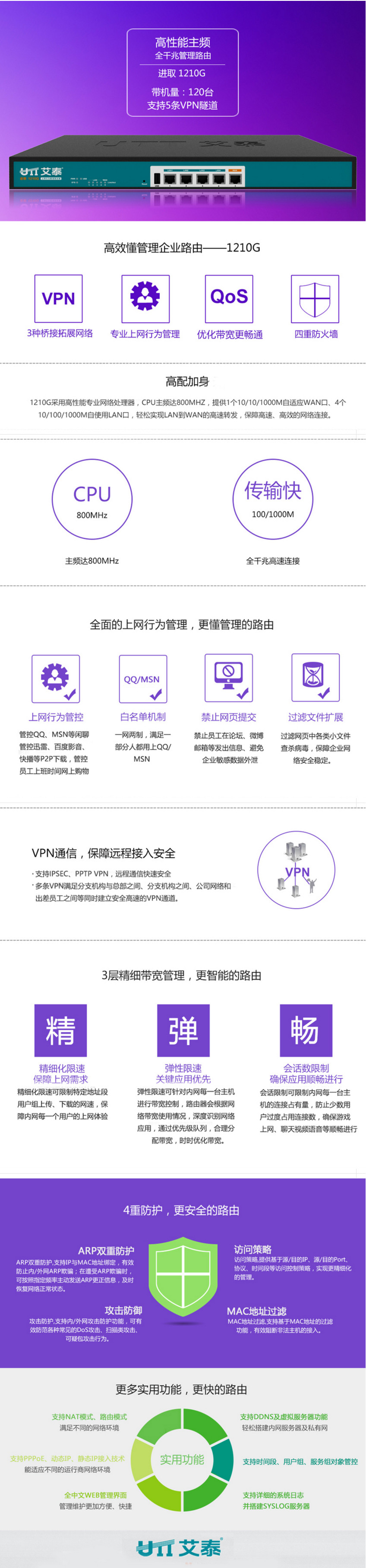商品名稱:C艾泰(UTT)1210G 全千兆企業(yè)級上網(wǎng)行為管理路由器(帶寬管理/VPN/端口鏡像)